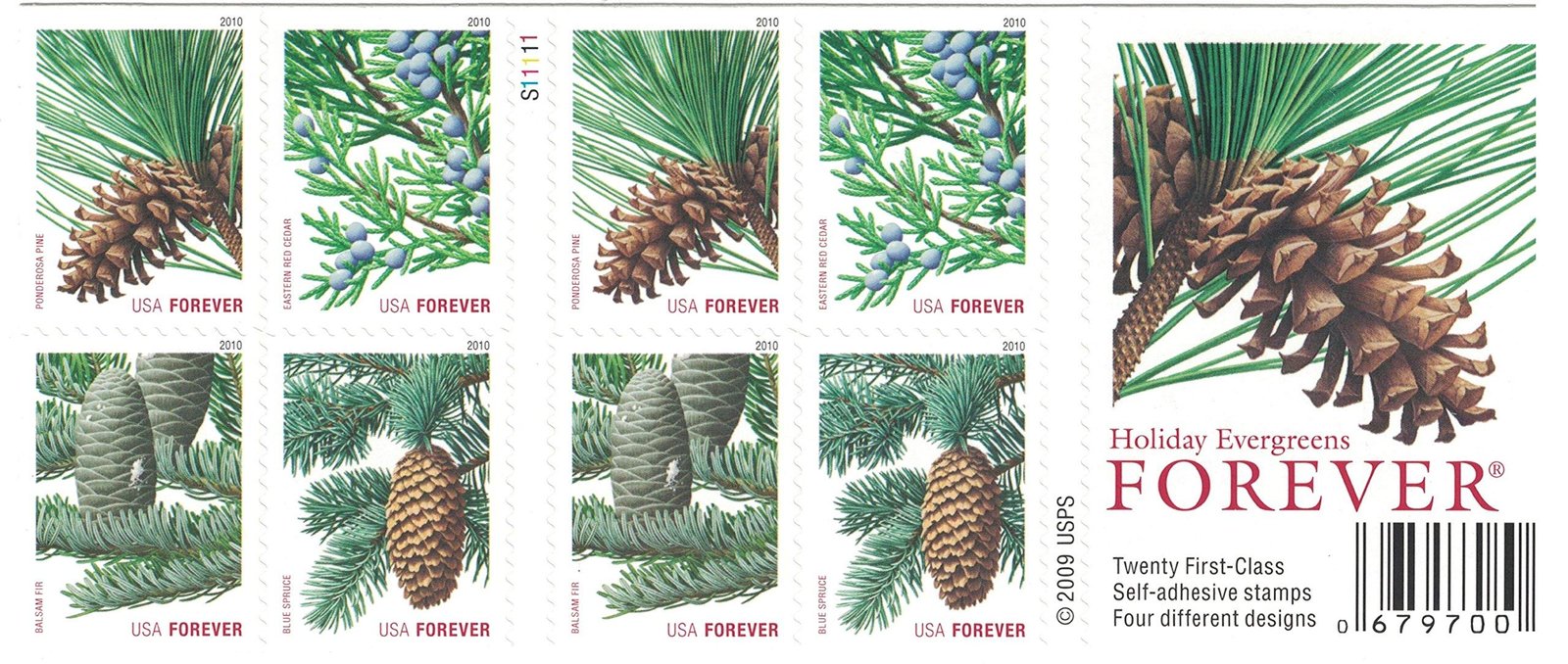 Perfect for collectors or daily mailing needs, the 2010 Holiday Evergreen Forever Stamps provide authentic U.S. postage and safe online ordering.