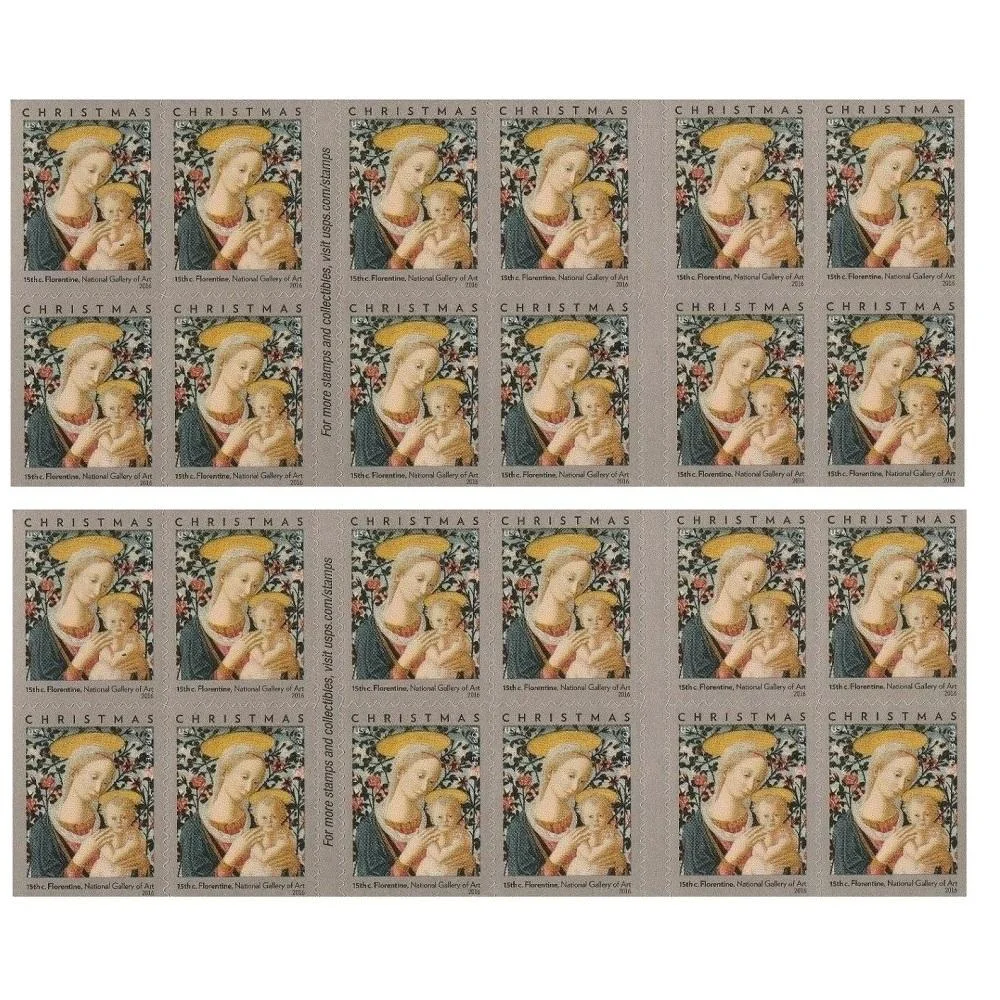 The 2016 Florentine Madonna and Child USPS Forever Stamps feature classical holiday artwork valid for First Class Mail. They maintain stable forever postage value.